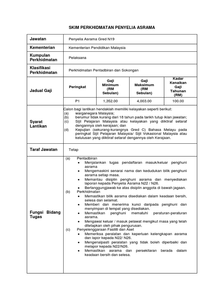 Penyelia Asrama Gred N19 1 kekosongan Lelaki b Klasifikasi. Menyelia kebersihan dapur dewan makan dan bangunan asrama Deskripsi Tugas Penyelia Asrama Gred N19 SPA.